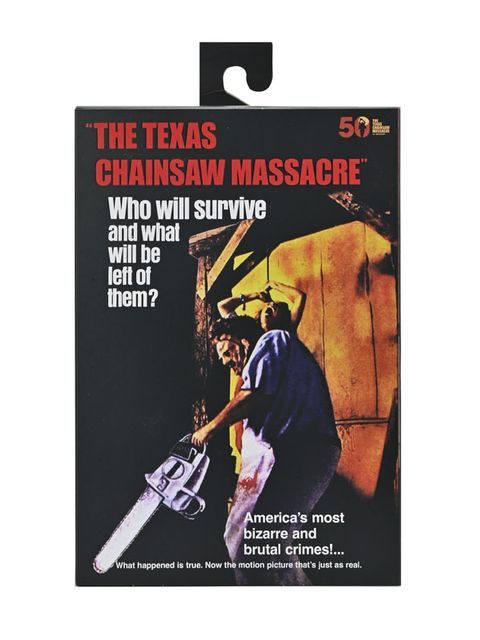 未だその鮮烈なインパクトが多くのファンを魅了する、トビー・フーパーによる映画『悪魔のいけにえ(Texas Chainsaw Massacre)』から、レザーフェイスが、ネカの人気シリーズ「アルティメット」フィギュアに完全リニューアルし50周年記念アイテムとしてカムバック!2つの異なるルックスを再現するために、エプロン2種、ヘッドパーツ3種他様々な無慈悲なダメージを加える武器たちが付属。パッケージには今だけの周年ロゴがデザインされているのもたまりません。不気味な自動のこぎりが(脳内で)唸る!