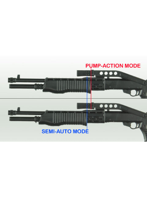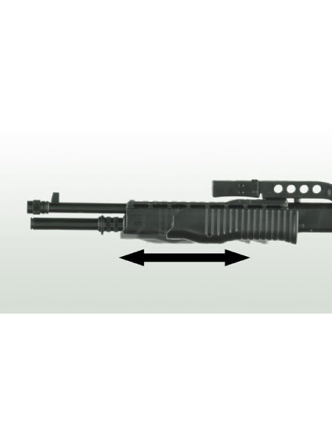 手動・自動がボタン操作にって切り替え可能で、装薬量の多いバックショットから装薬量の少ない低致死性ラバーショットまで、幅広い弾種を扱うことができます。武骨なボディから威力のある散弾を次々撃ち出す姿から、メディアへの露出も多く「強い散弾銃」の代名詞的存在です。